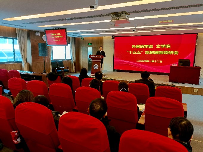 为精准谋划 “十五五” 时期发展路径,凝聚学院发展合力,1月12日,外国语学院、文学院联合召开 “十五五” 规划编制调研会。校党委书记董必荣出席并作调研指导讲话,为学院“十五五”规划编制把脉定向、指路领航。两学院全体教师参加会议。
